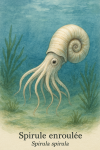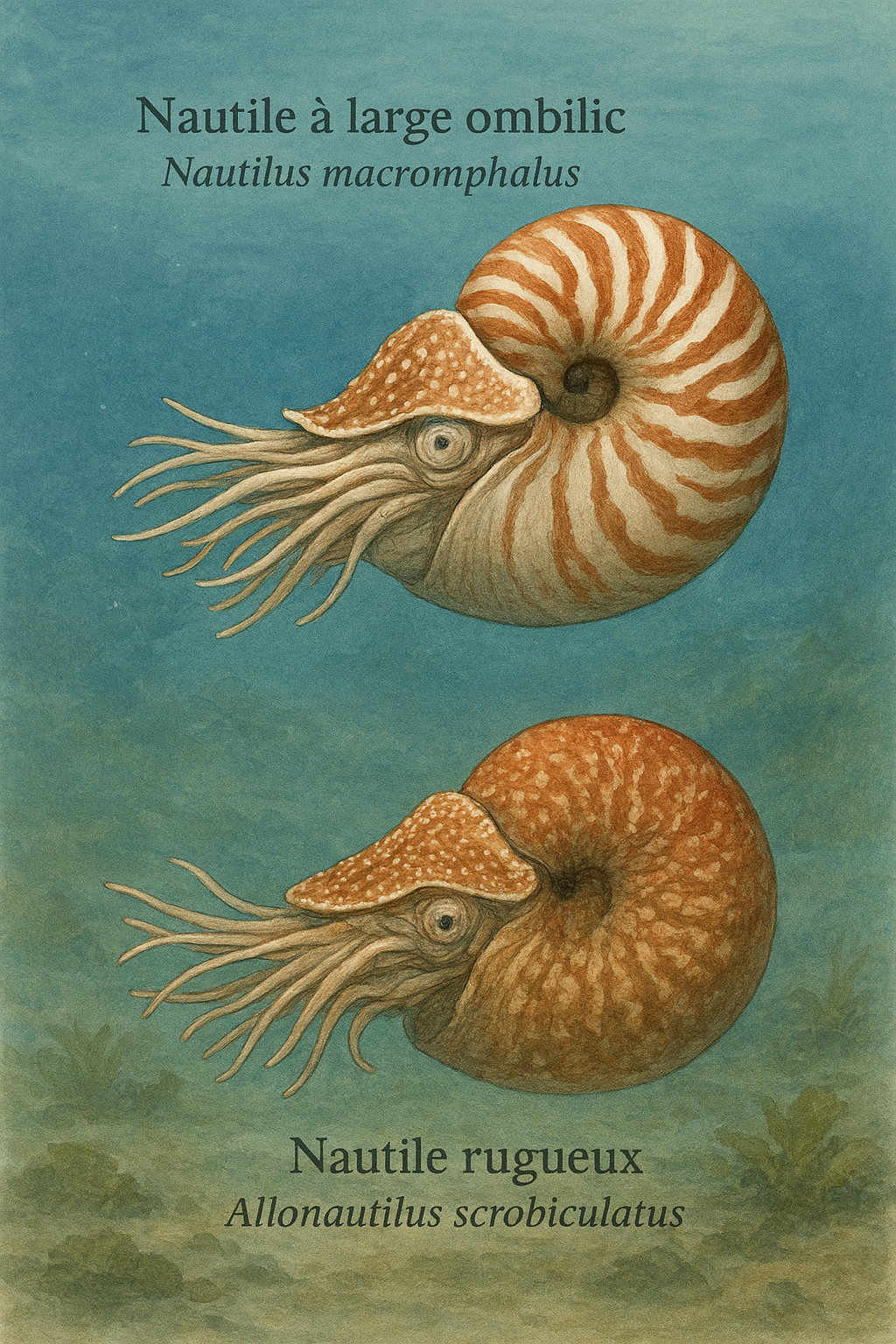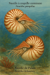 environnement marin bleu-vert. En haut, le "Nautile à large ombilic" (Nautilus