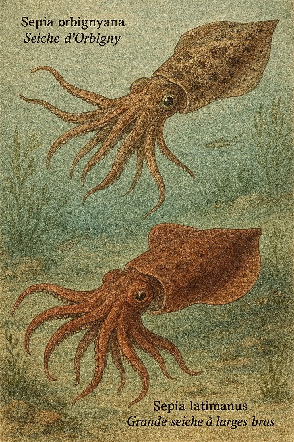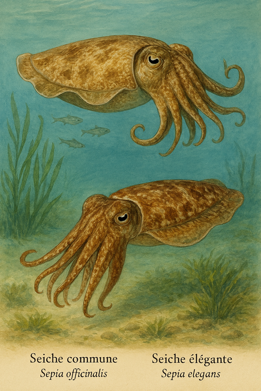 subtulé, nommé Alloteuthis subulata, apparaît en bas. Le décor
