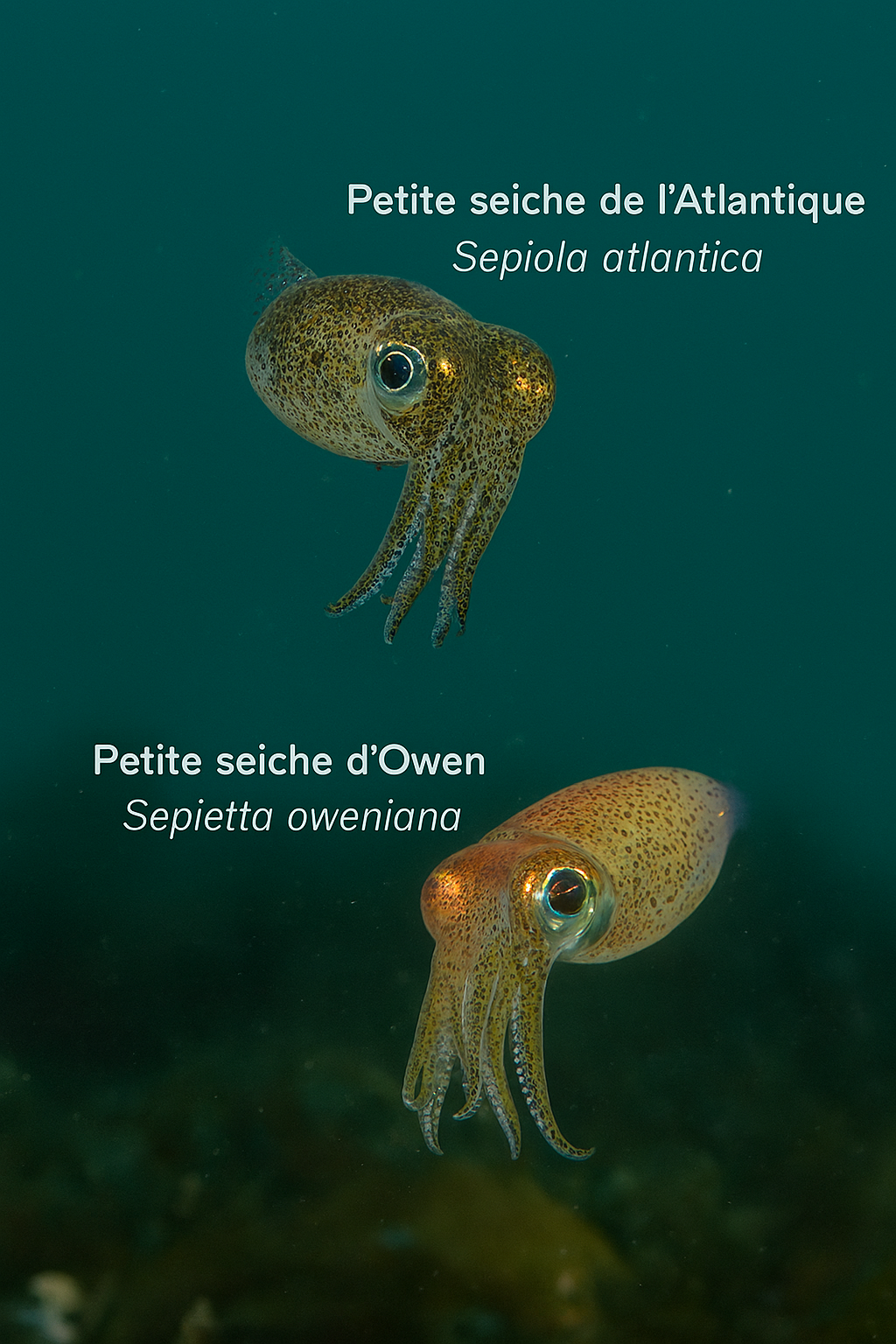 sombre. En haut, la petite seiche de l’Atlantique, Sepiola atlantica,