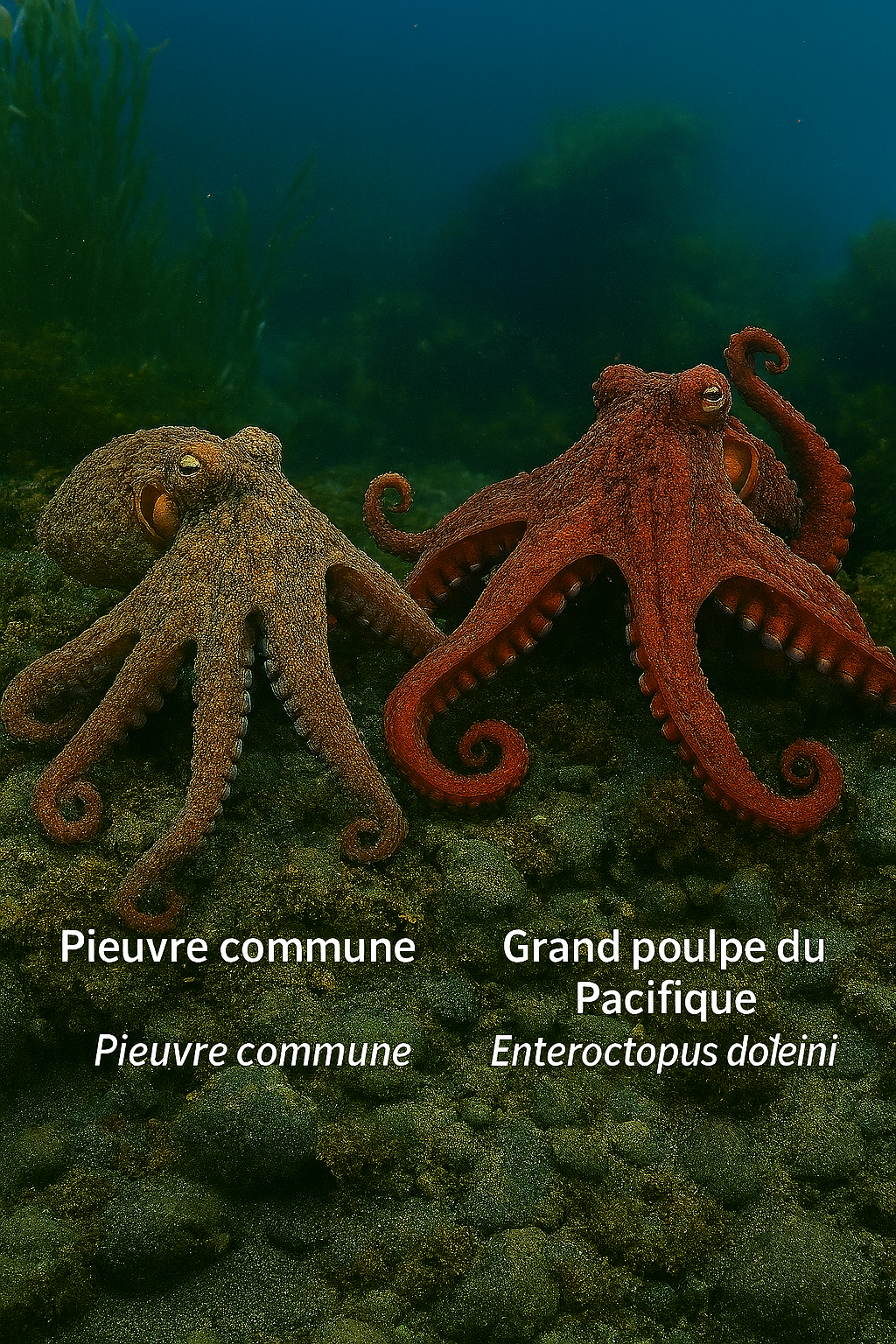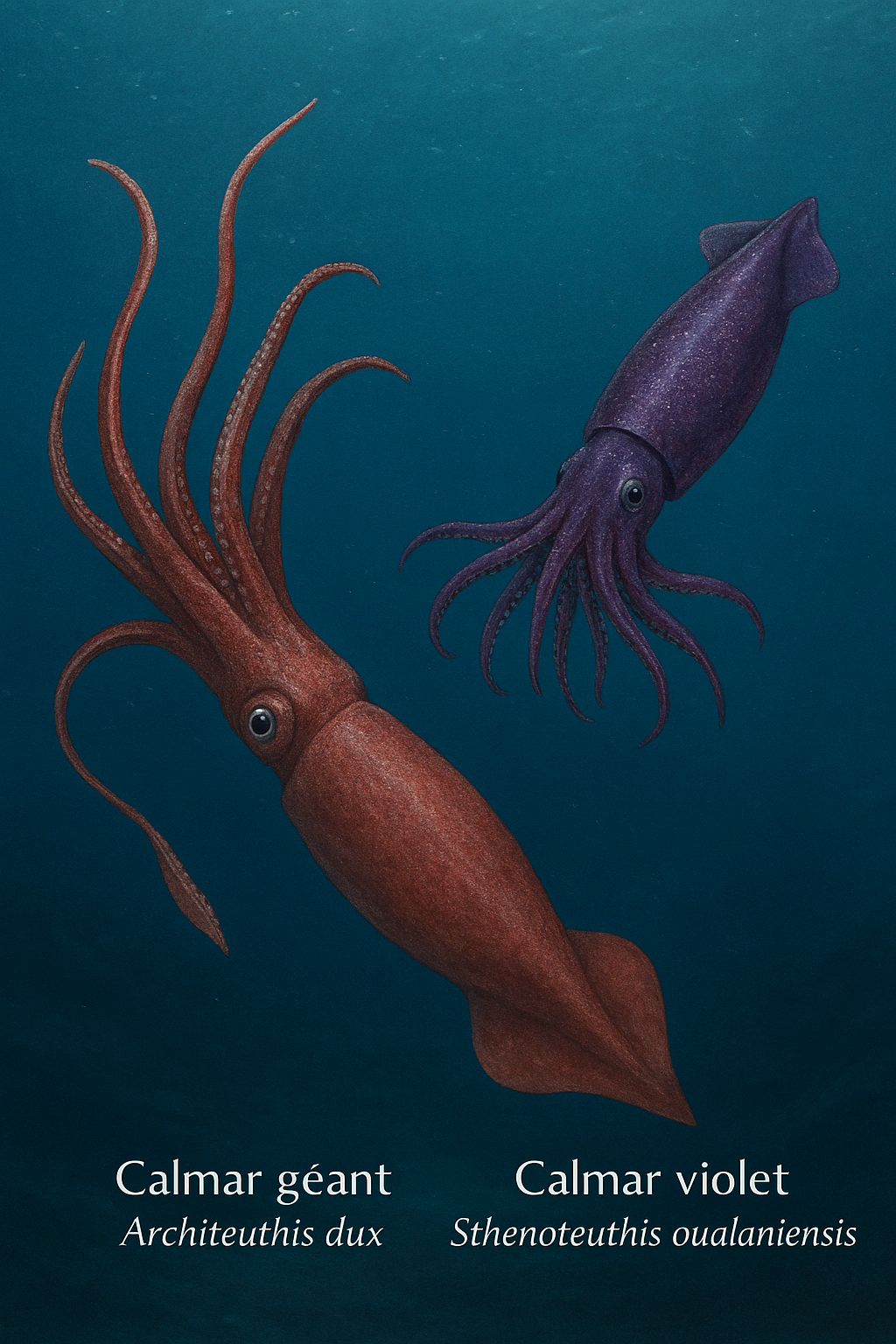 La première image représente deux espèces de calmars dans leur
