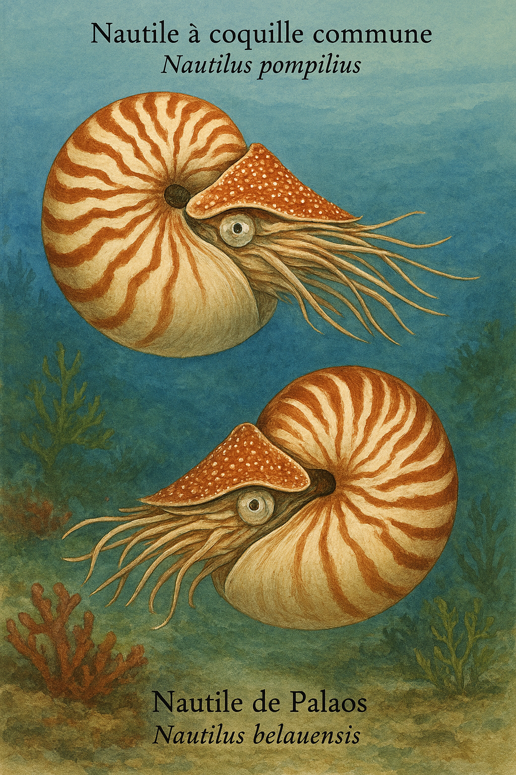 "Nautile de Palau" (Nautilus belauensis) sont illustrés dans un
