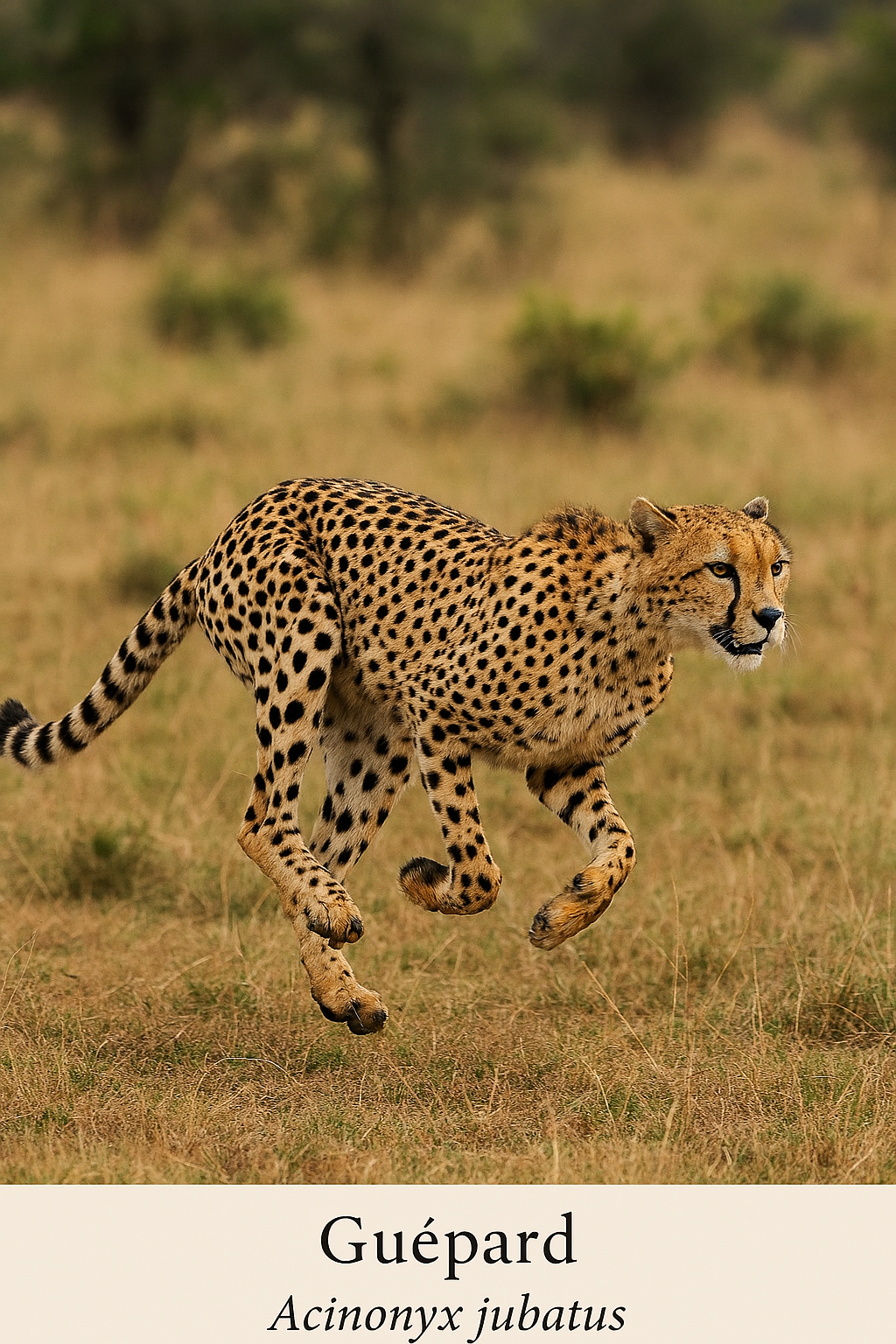 L’image montre un guépard courant à grande vitesse sur une plaine