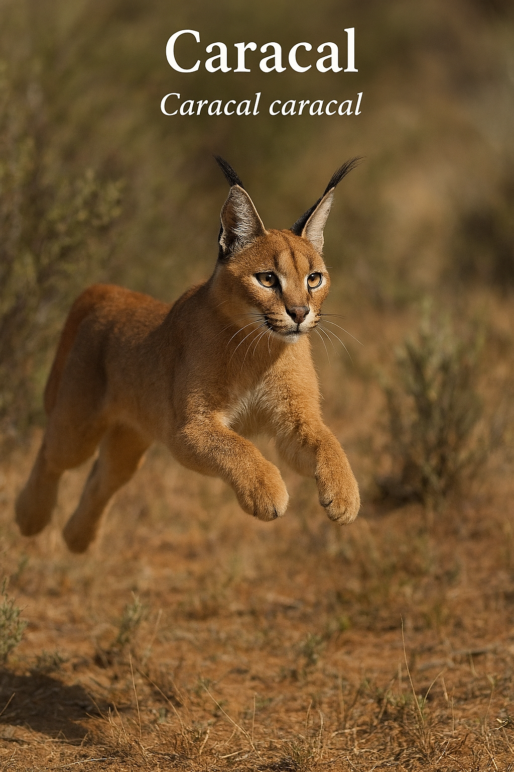 L’image montre un caracal en plein saut au-dessus d’un paysage sec et