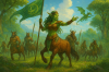 tient au centre d’une clairière lumineuse brandissant un drapeau vert