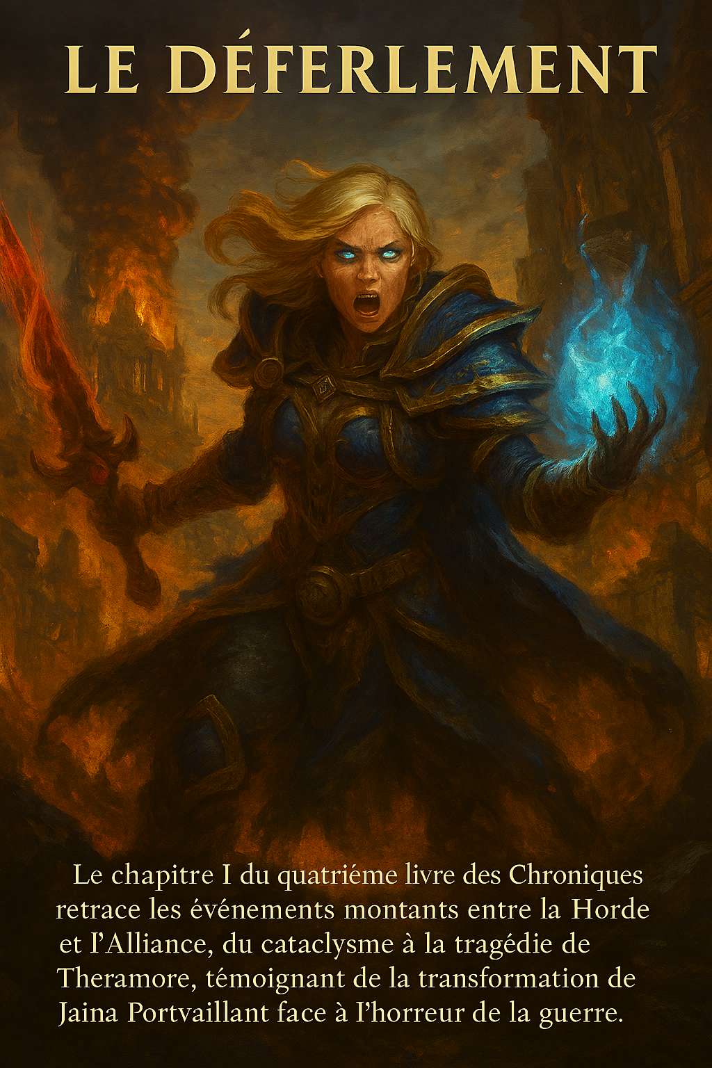 flammes bleues surnaturelles. Le fond est embrasé et chaotique, évoquant