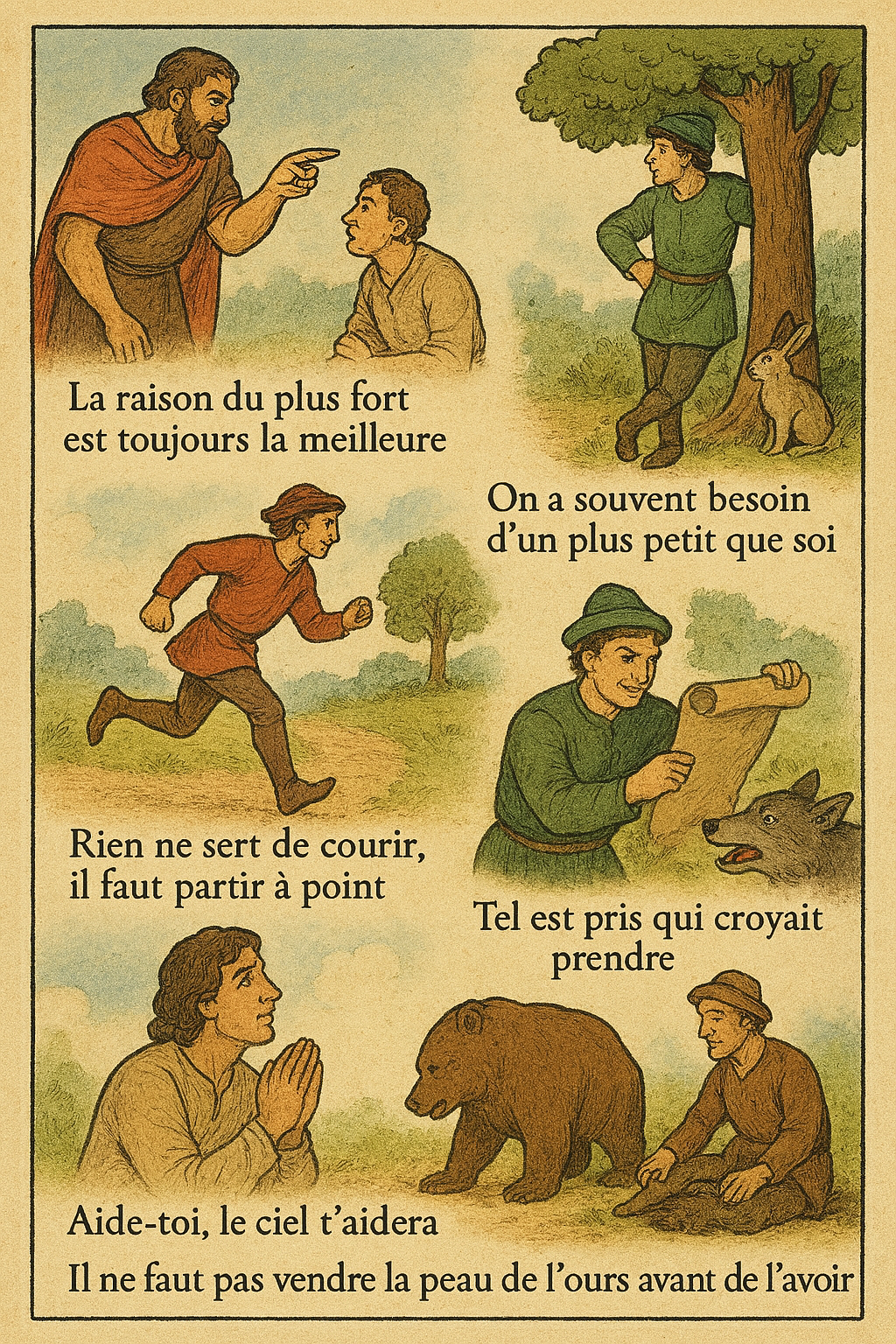 emblématiques de ses fables, ainsi que d’autres figures en arrière-plan