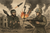 fumée et traversé par des projectiles, tandis qu’un soldat armé avance,