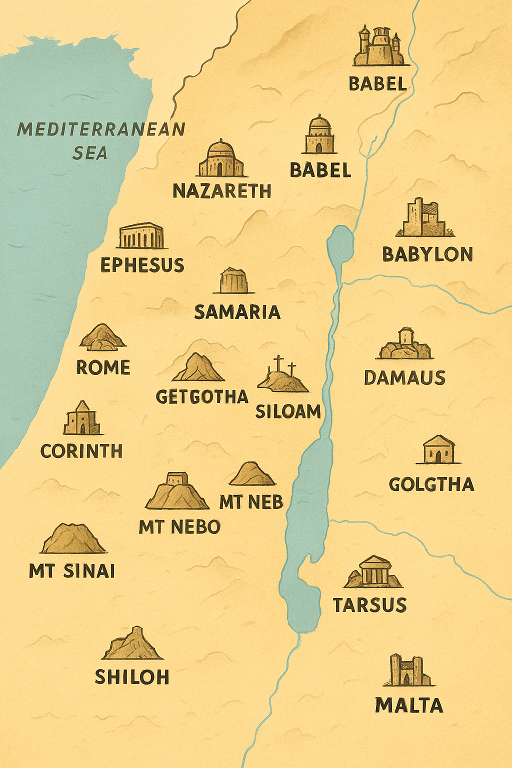 Tarse, Malte, Rome, Corinthe, Éphèse, Nazareth, Samarie, Shilo, Geboyra