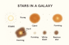 de toutes sortes d'étoiles Ce dessin présente une typologie visuelle des étoiles présentes dans une galaxie, en illustrant différentes phases de leur évolution et leurs tailles relatives. On y trouve une étoile jeune marquée "Young", une étoile géante nommée "Giant", une étoile en formation indiquée "Forming", une étoile en fusion appelée "Fusing", une étoile mourante désignée "Dying", ainsi que deux résidus stellaires : une naine blanche ("White Dwarf") et une étoile à neutrons ("Neutron star"). Chaque type est représenté par une forme et une couleur distinctes, permettant d’identifier rapidement leur stade de vie et leur nature physique. L’ensemble offre une vue synthétique du cycle stellaire, depuis la naissance jusqu’aux états finaux, en soulignant la diversité des objets stellaires qui composent une galaxie. ------------------