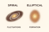 sortes de galaxies Ce dessin présente une comparaison visuelle entre deux types de galaxies : à gauche, une galaxie spirale est représentée avec une structure en disque plat et des bras enroulés, accompagnée des mentions "SPIRAL" et "FLUCTUATIONS", suggérant une dynamique interne marquée par des variations de densité ou de matière. À droite, une galaxie elliptique est illustrée sous forme d’une masse arrondie et homogène, sans bras distincts, avec les termes "ELLIPTICAL" et "FORMATION", indiquant une origine ou une évolution différente, plus uniforme. L’image met en évidence les contrastes morphologiques et typologiques entre ces deux grandes familles galactiques, en soulignant à la fois leur structure et les processus qui les caractérisent. ------------------