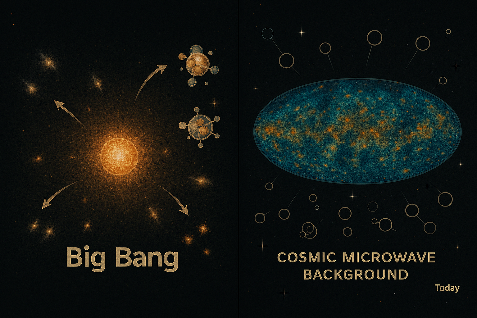 deux parties. À gauche, le Big Bang est représenté par un point lumineux orange