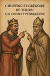 du doigt. Face à lui, Grégoire de Tours porte une mitre
