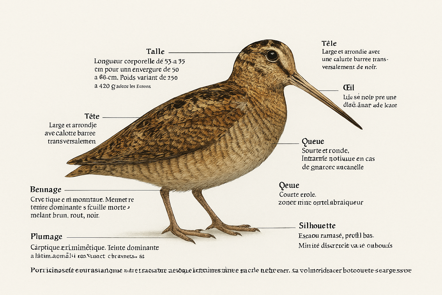 L’image représente un schéma annoté d’une bécasse, mettant en évidence