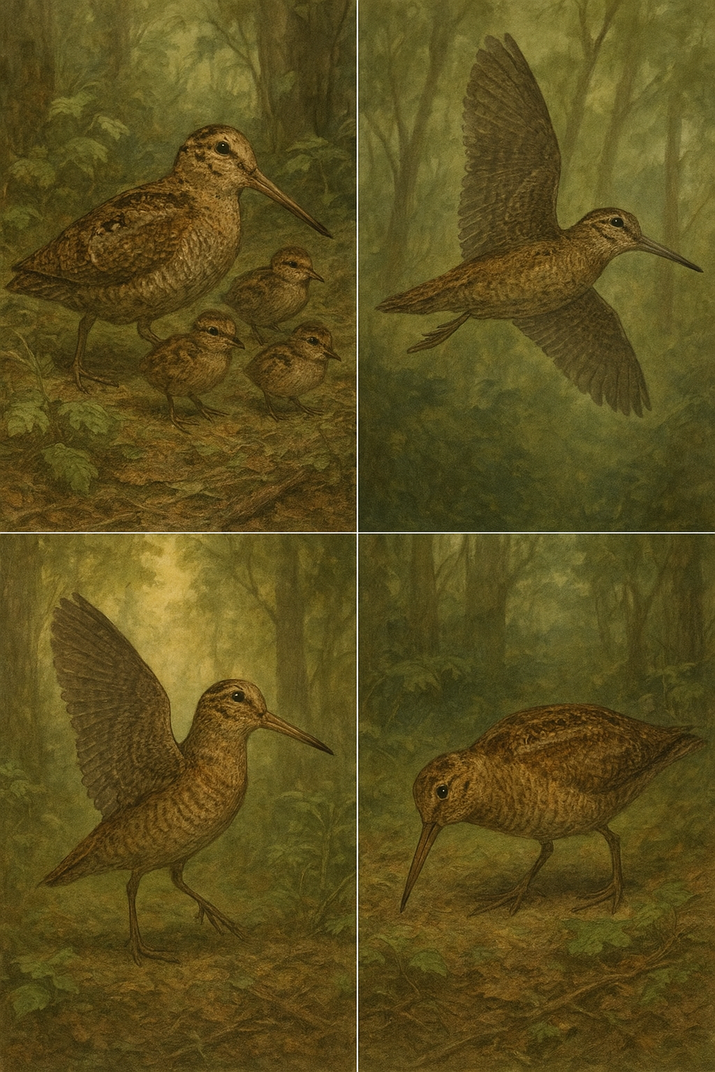L’image est divisée en quatre scènes illustrant une bécasse dans son