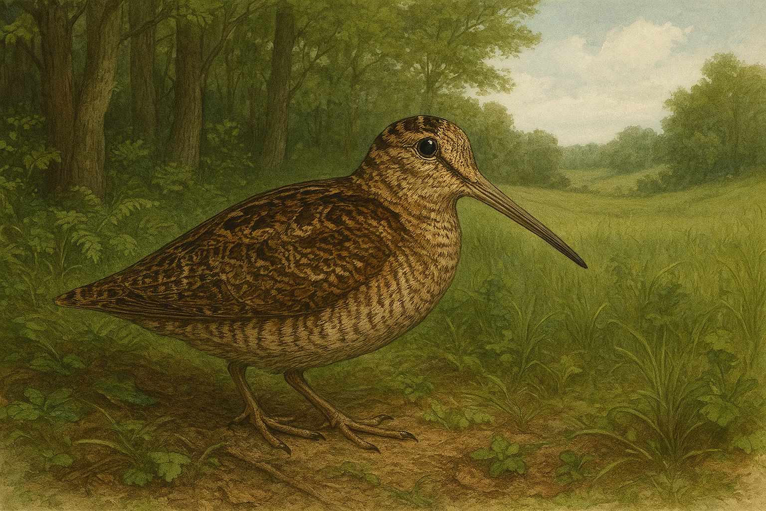 broussailles. En haut à droite, une bécasse est en vol, ailes déployées,