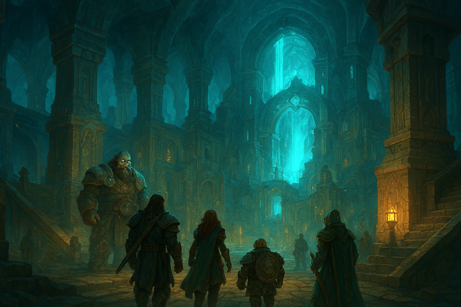 piliers massifs et des arches gravées de glyphes anciens. Des lueurs