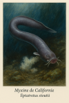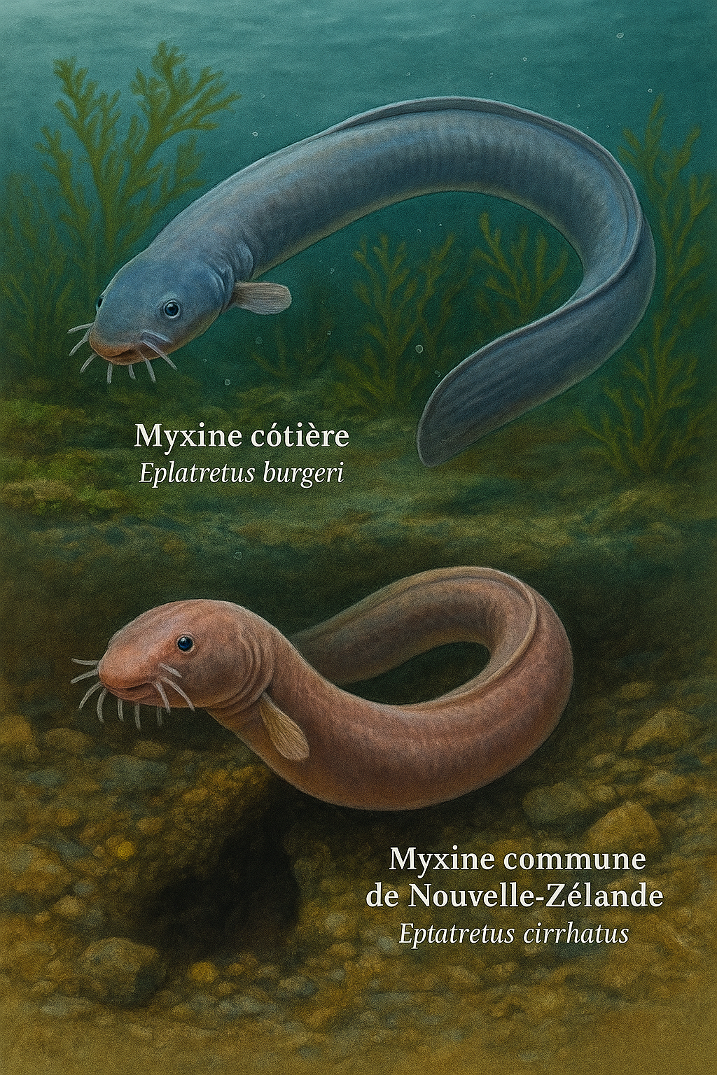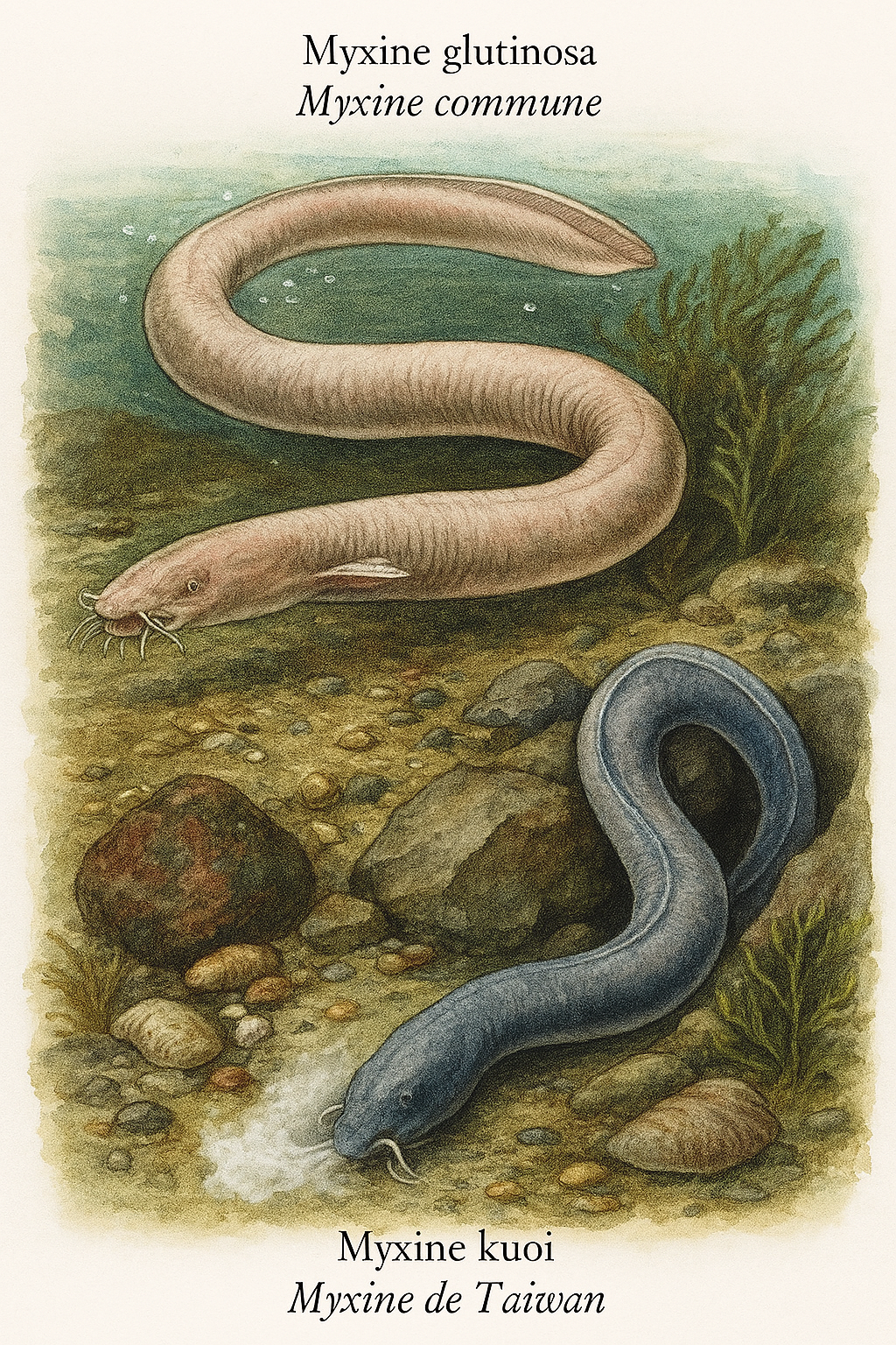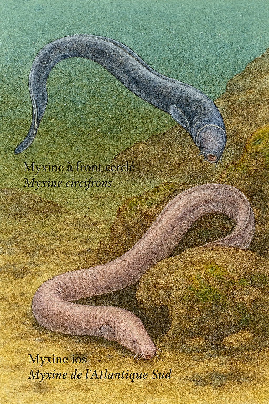 myxine commune, est représentée avec une teinte rose pâle. En bas, la