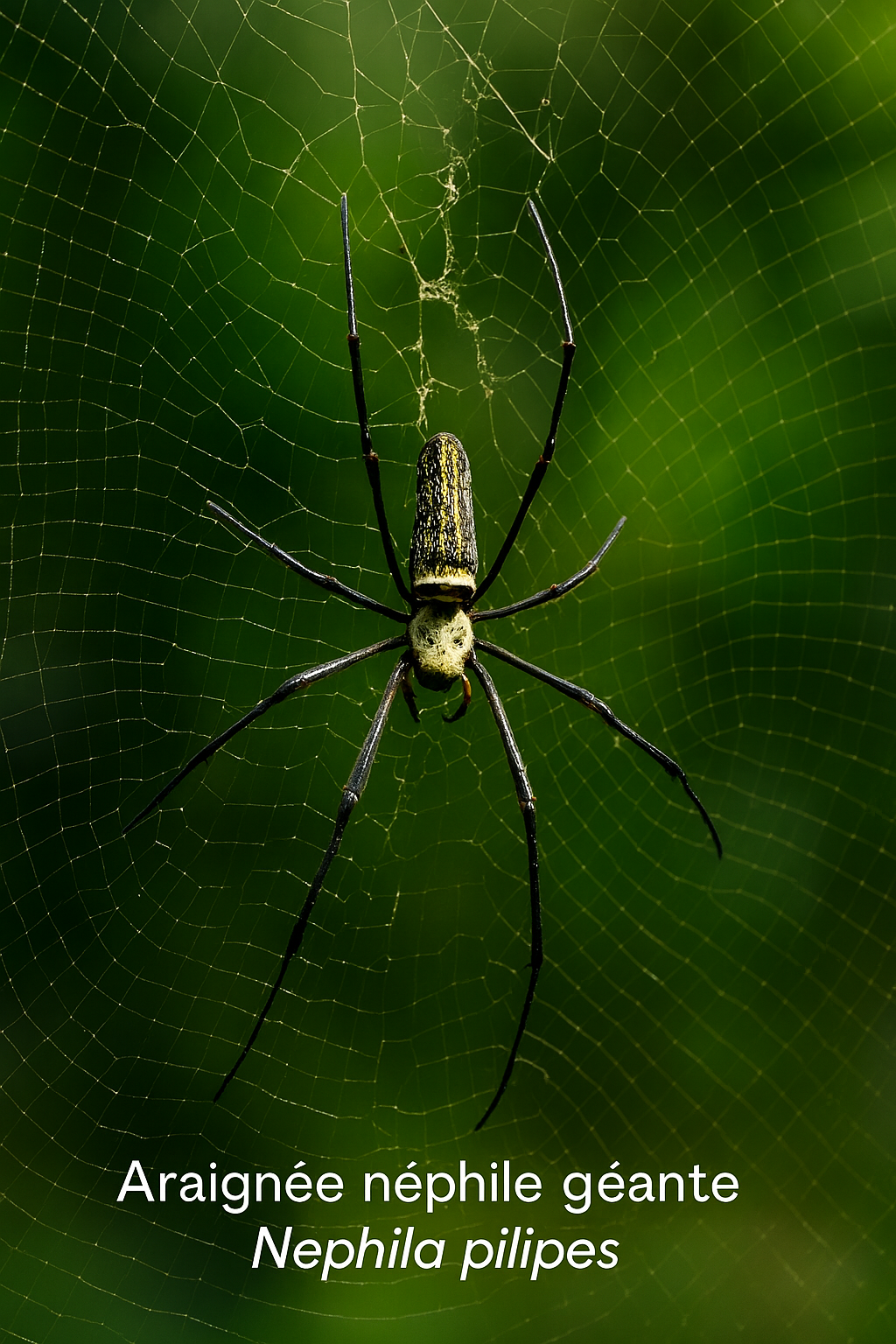Nephilidae. La femelle peut atteindre jusqu’à 20 cm d’envergure avec un