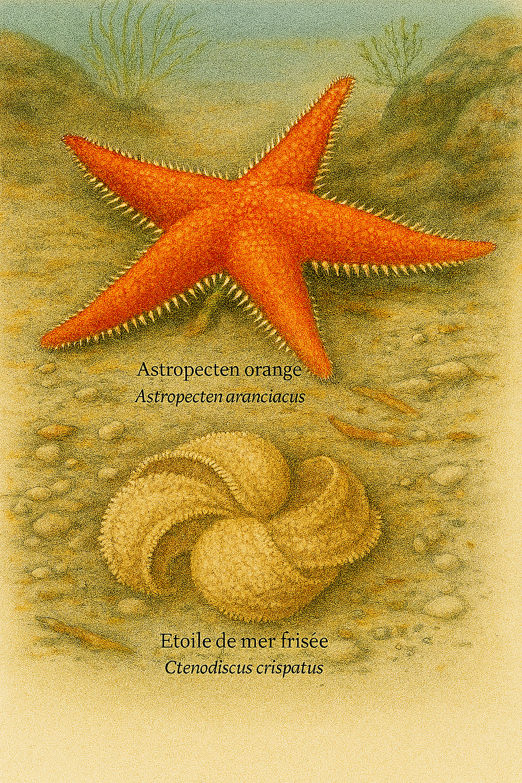L’image supérieure montre Astropecten aranciacus, une étoile de