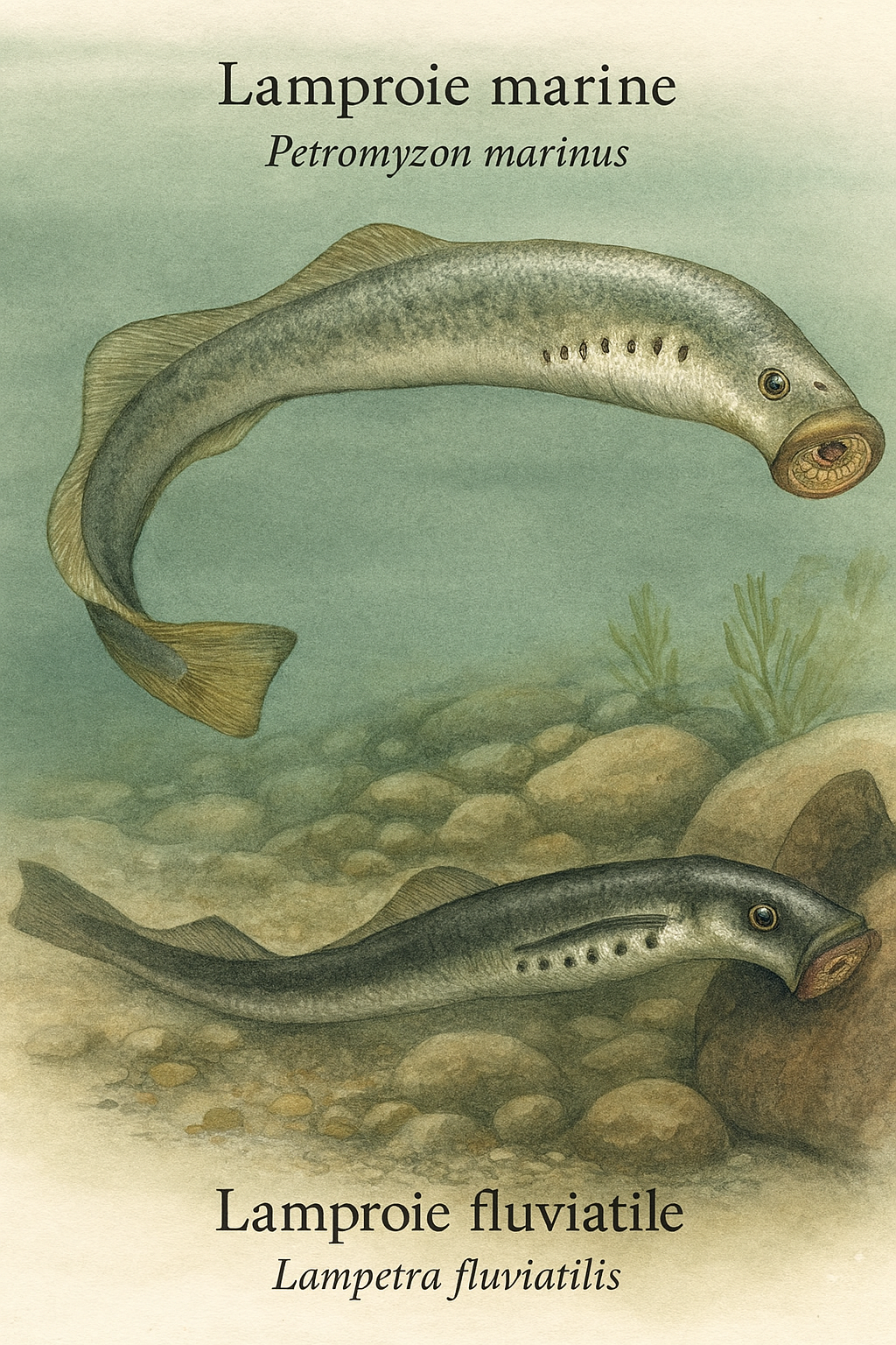 L’illustration montre deux espèces de lamproies dans leur habitat