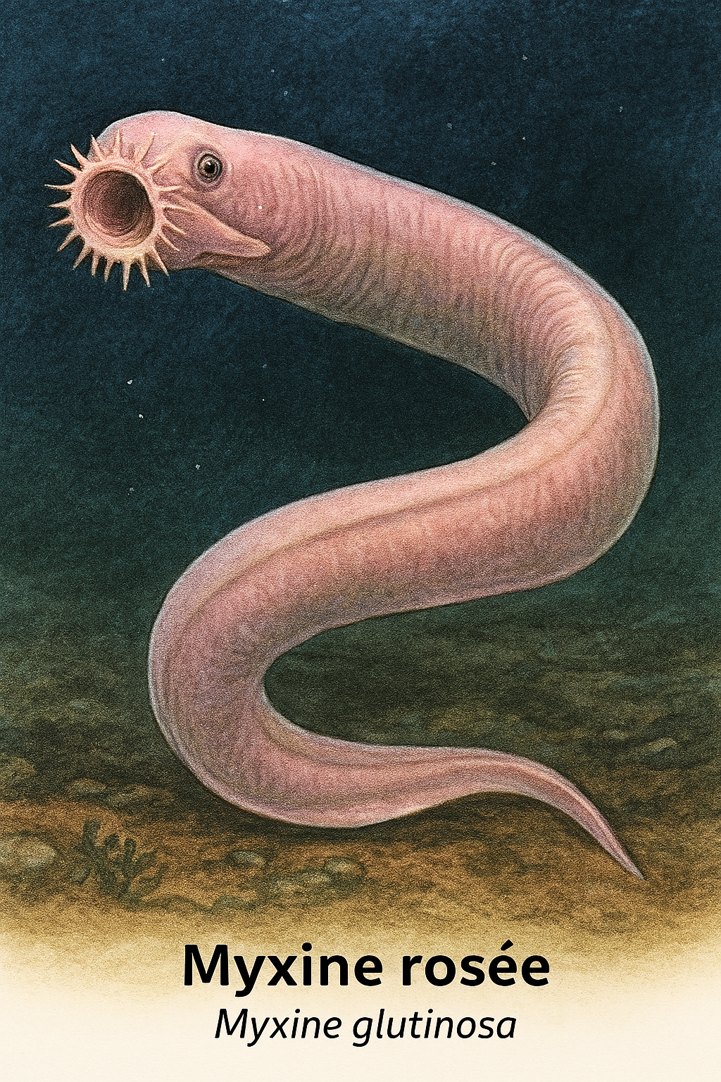 L’image représente une myxine rosée Myxine glutinosa, un poisson