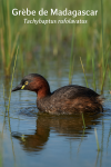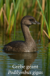 tête brune et un corps grisâtre. Des roseaux verts bordent l’eau calme,