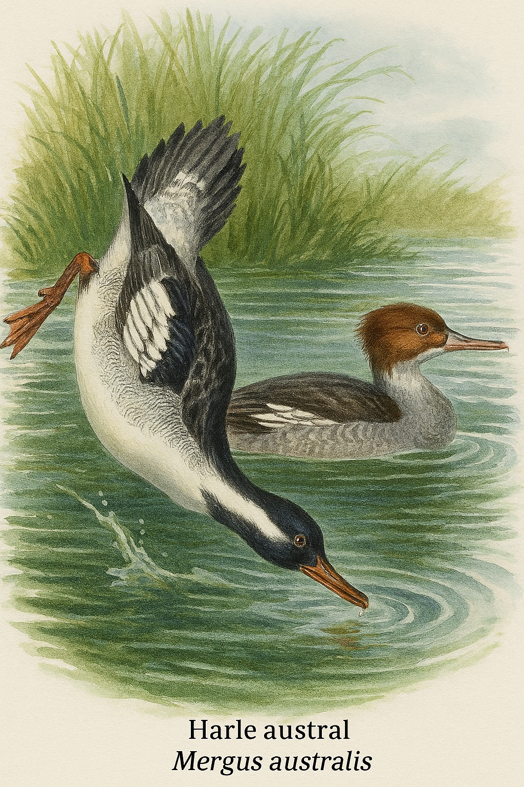 Le dessin représente deux spécimens de Mergus australis, ou Harle