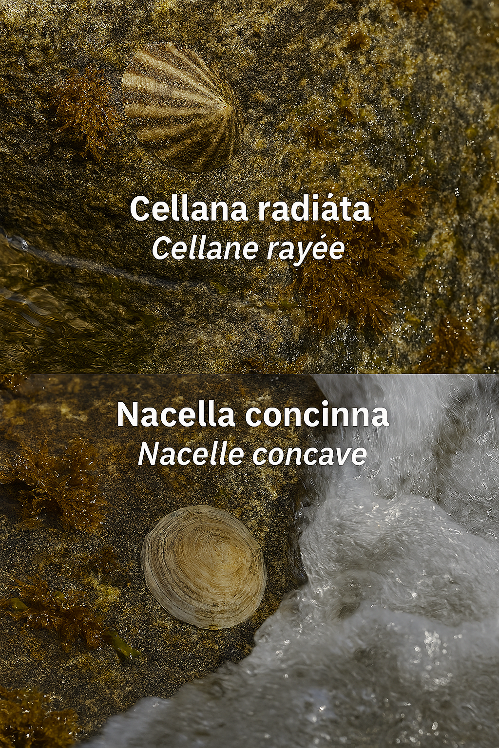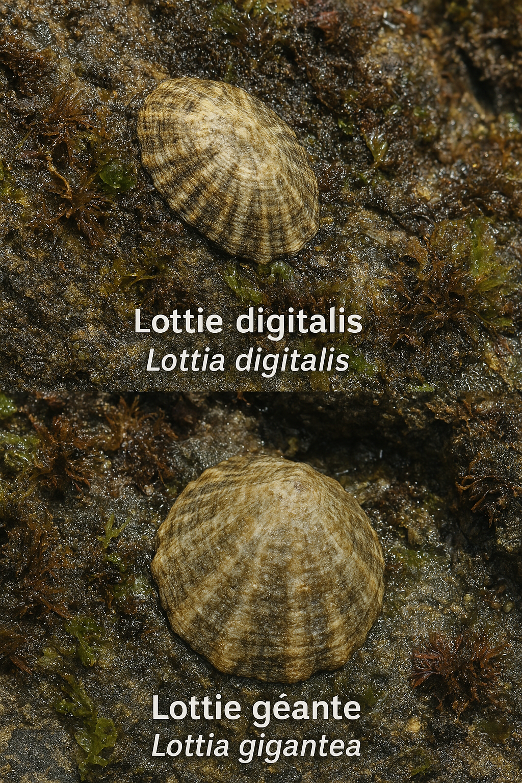 La première image montre deux espèces de patelles fixées
