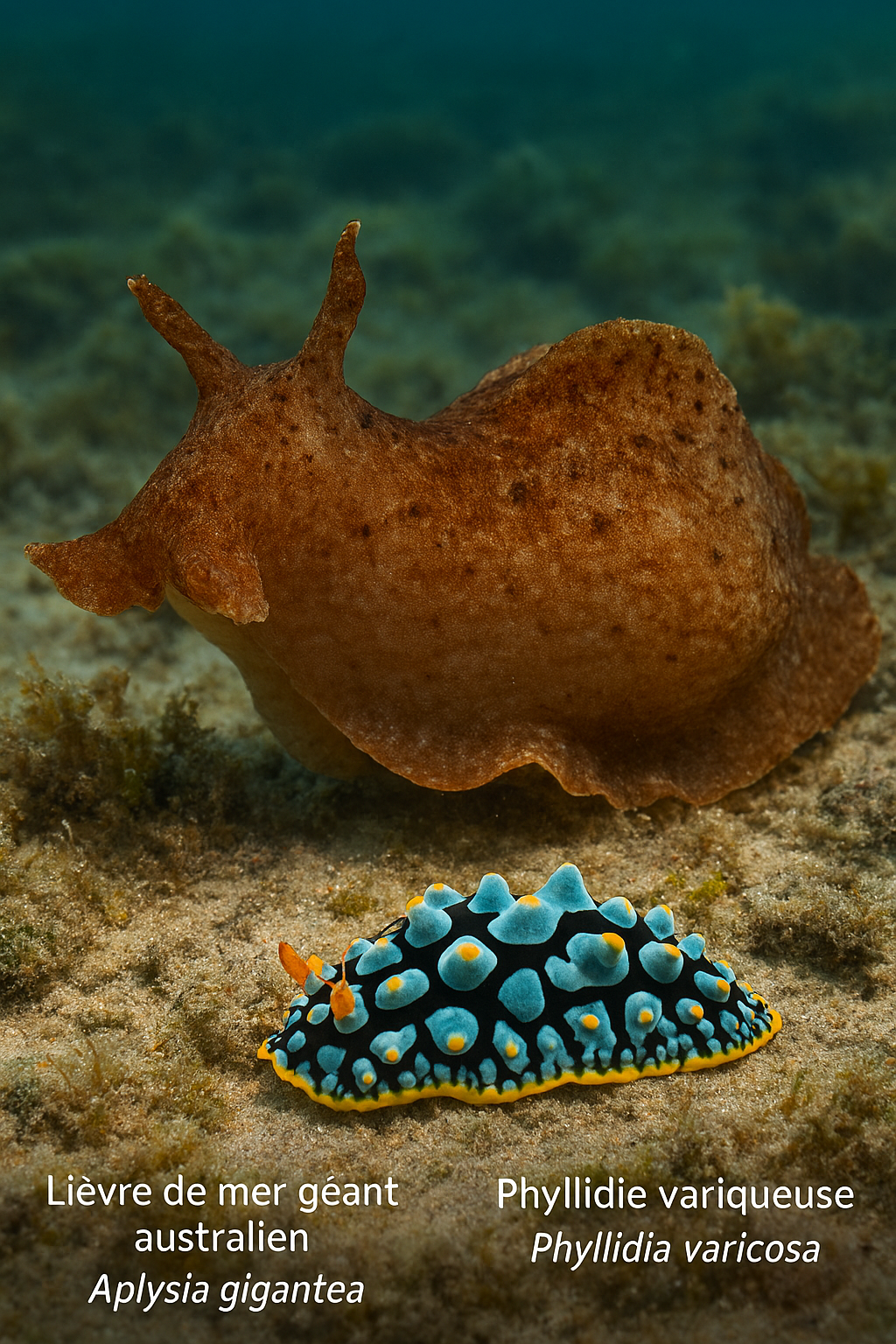 à l’arrière-plan, le Lièvre de mer géant australien (Aplysia