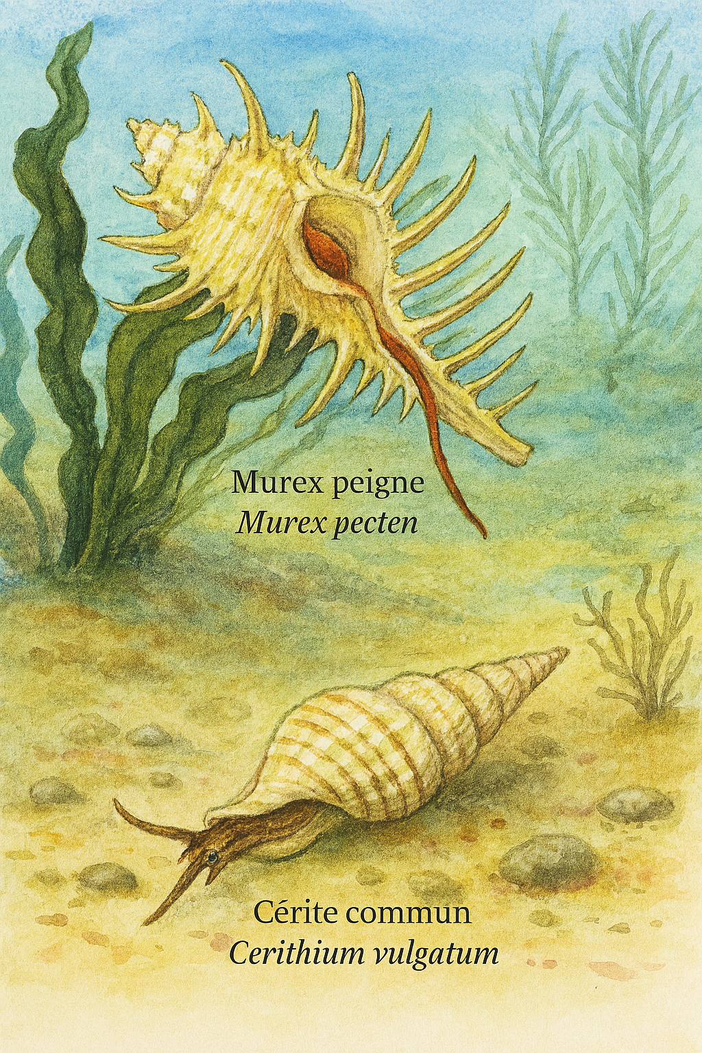 allongé. En bas, Cerithium nodulosum, appelé "Cérith corniculé",