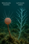emblématiques des Hexactinellides. À gauche, l’éponge fossile d’Hexactinella