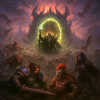 démoniaque dans sa main gauche. Derrière lui, un portail infernal