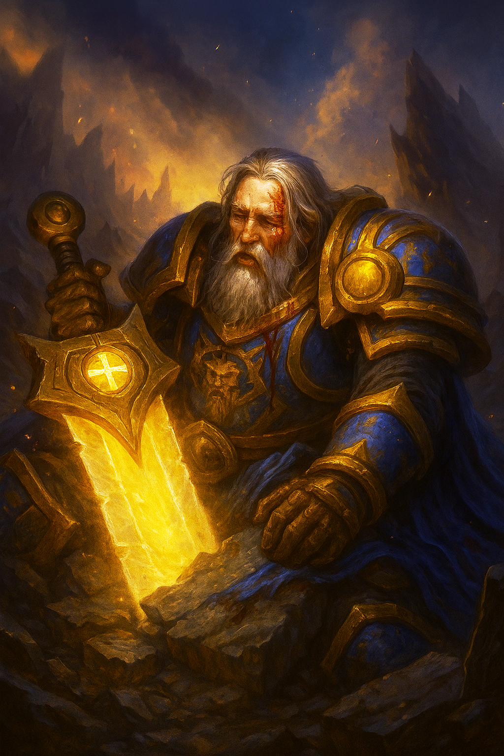 Il est vêtu de son armure bleue et dorée emblématique, le visage marqué