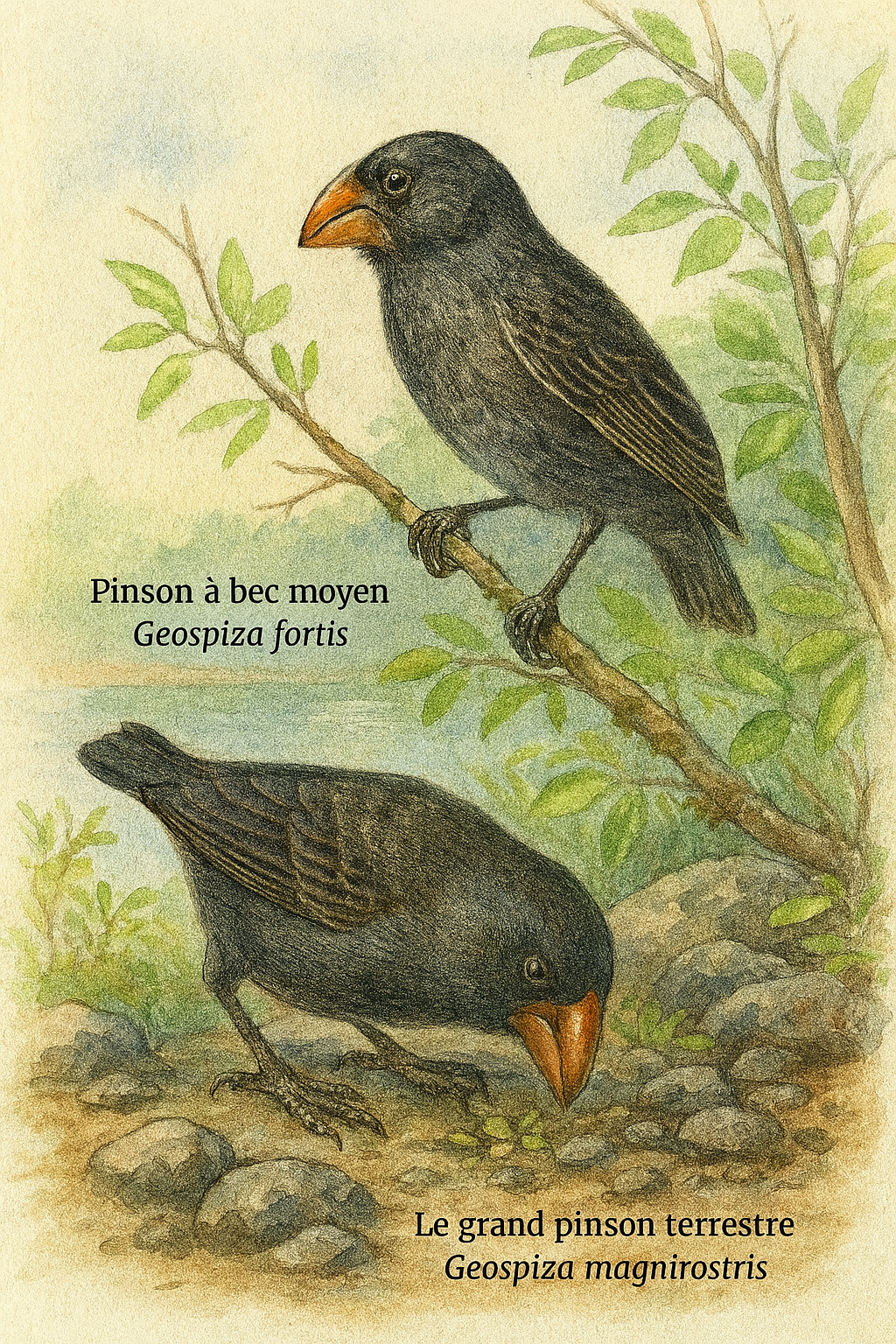 dimorphisme sexuel. Geospiza magnirostris est le plus massif des pinsons