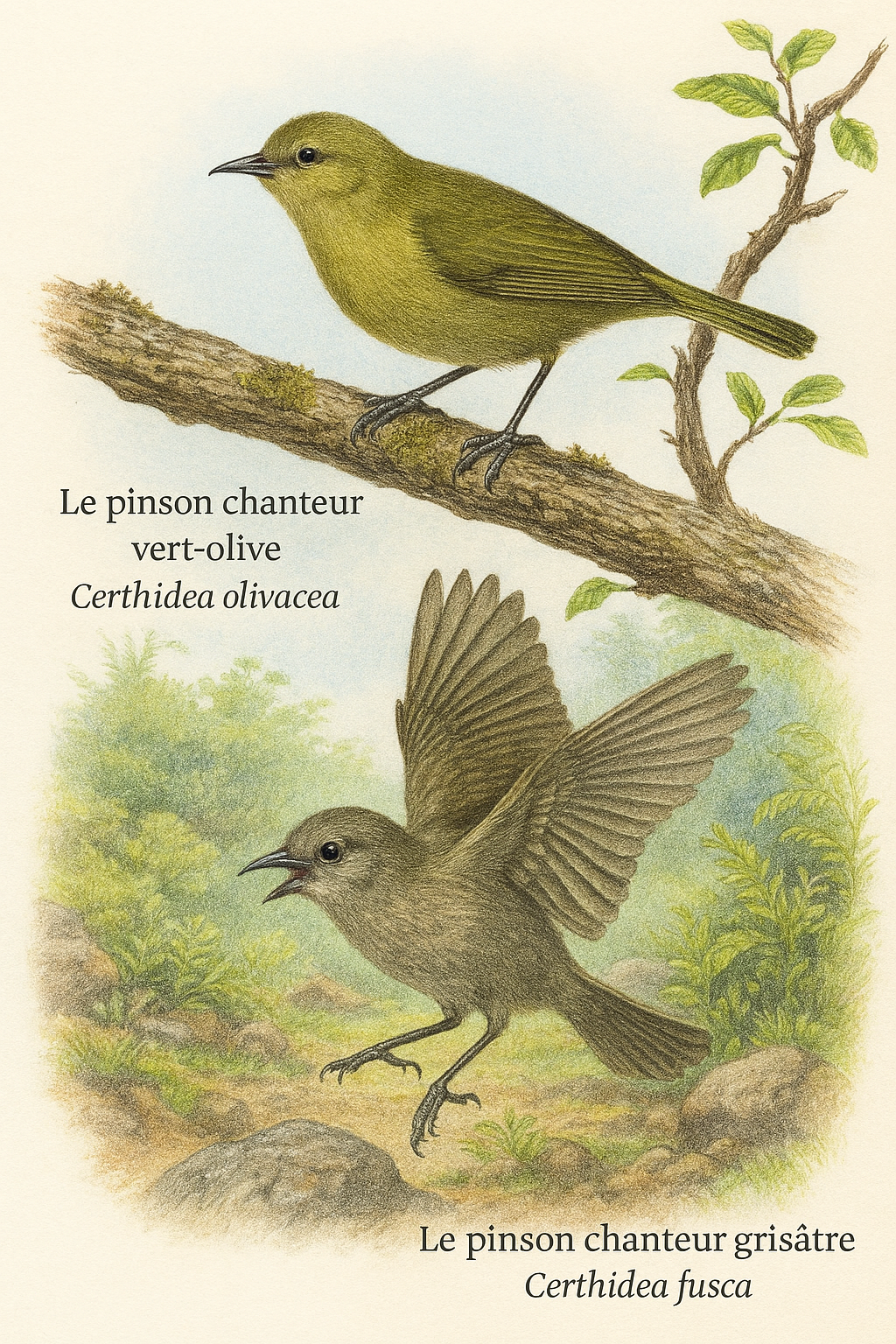 habitats variés des Galápagos. Certhidea fusca est plus spécialisée, plus
