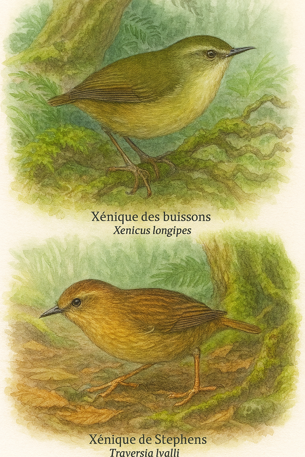 Sur la seconde image, le Xénique des buissons (Xenicus longipes) était