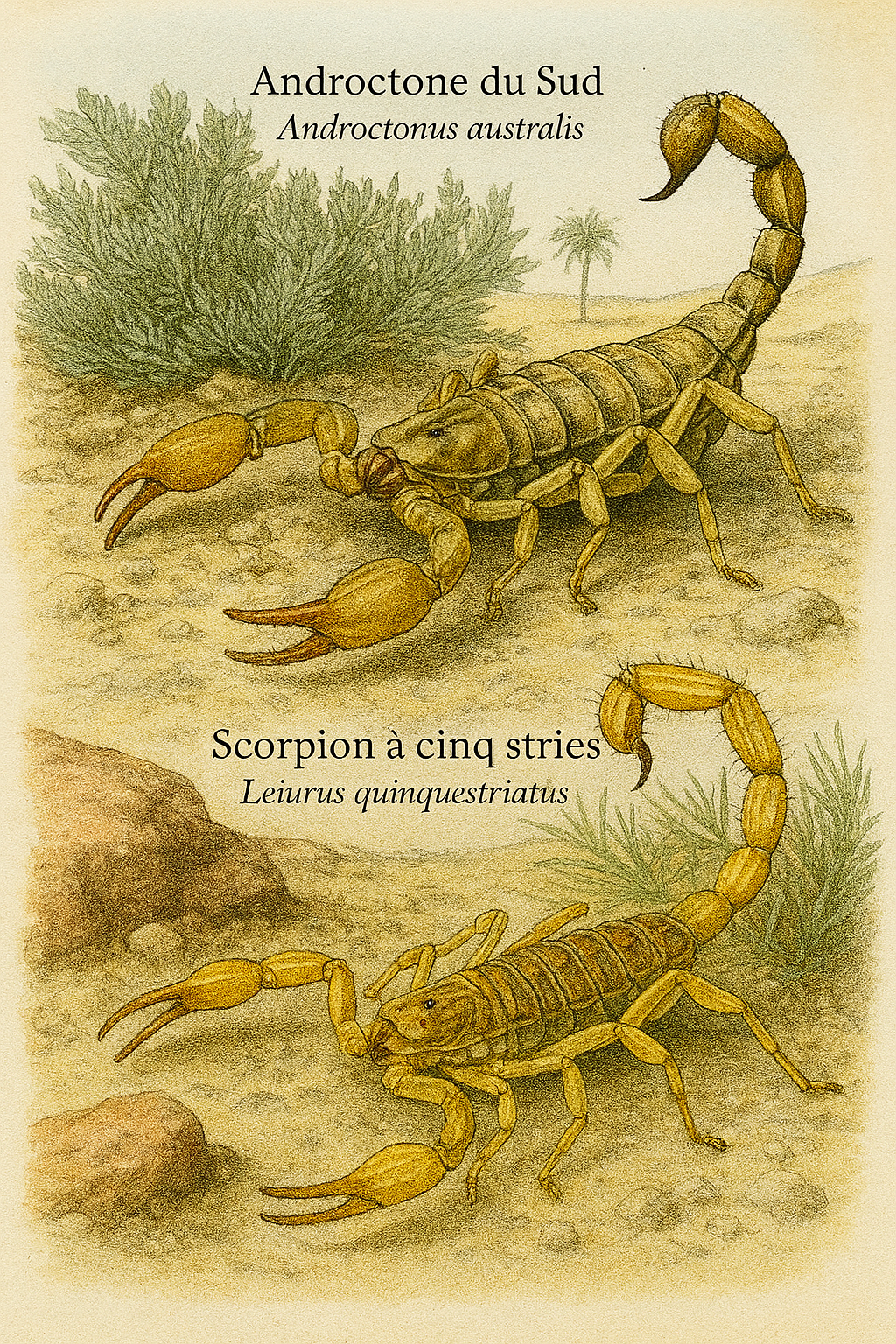 Androctonus australis, Leiurus quinquestriatus, Tityus