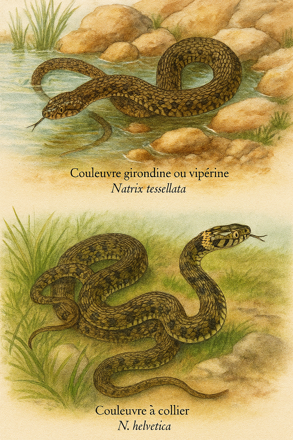 semi-aquatique, la couleuvre helvétique fréquente les zones humides, la
